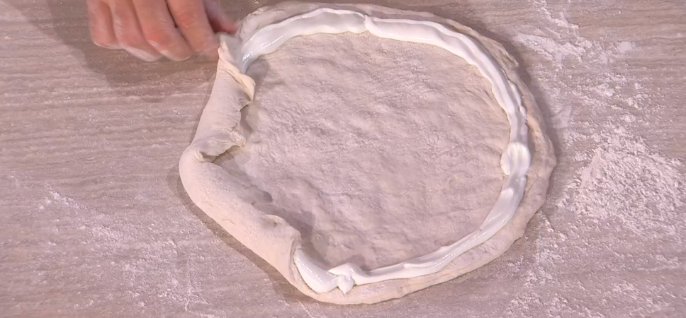 Con le mani, stendiamo ciascun panetto, formando un disco sottile anche sui lati. Disegniamo il bordo della pizza con della ricotta (mantecata con sale, pepe e olio). Ripieghiamo l’impasto sulla ricotta, formando il cornicione. Condiamo la parte centrale della pizza con i pelati schiacciati ed il fiordilatte tritato. Cuociamo in forno caldo e statico a 250° per circa 15 minuti: Vicenzo consiglia di posizionarla su una pietra refrattaria rovente o una placca da forno rovente.