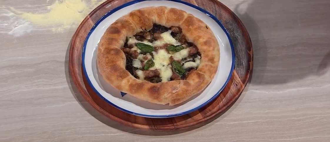 Stendiamo ogni panetto sul piano infarinato, schiacciando con le mani dal centro verso i bordi (che devono rimanere più alti). Condiamo la parte centrale con i friarielli ripassati in padella, la provola a fette, salsiccia cruda sbriciolata e basilico fresco.