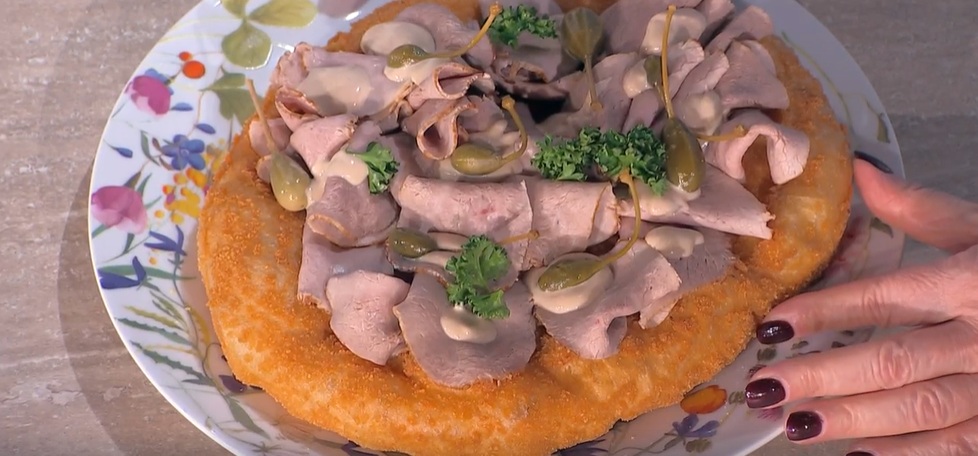 Le serviamo con sopra il vitello tonnato tagliato sottile, la salsa tonnata e, infine, i fiori di capperi.
