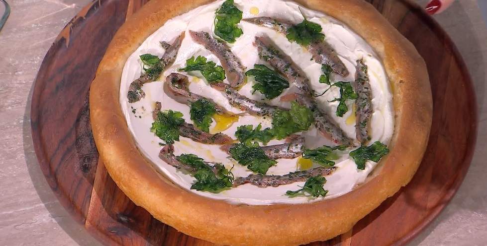All’uscita dal forno, togliamo i ceci e la carta forno e spalmiamo sulla superficie il mascarpone, quindi finiamo con le acciughe e del prezzemolo tritato o fritto.