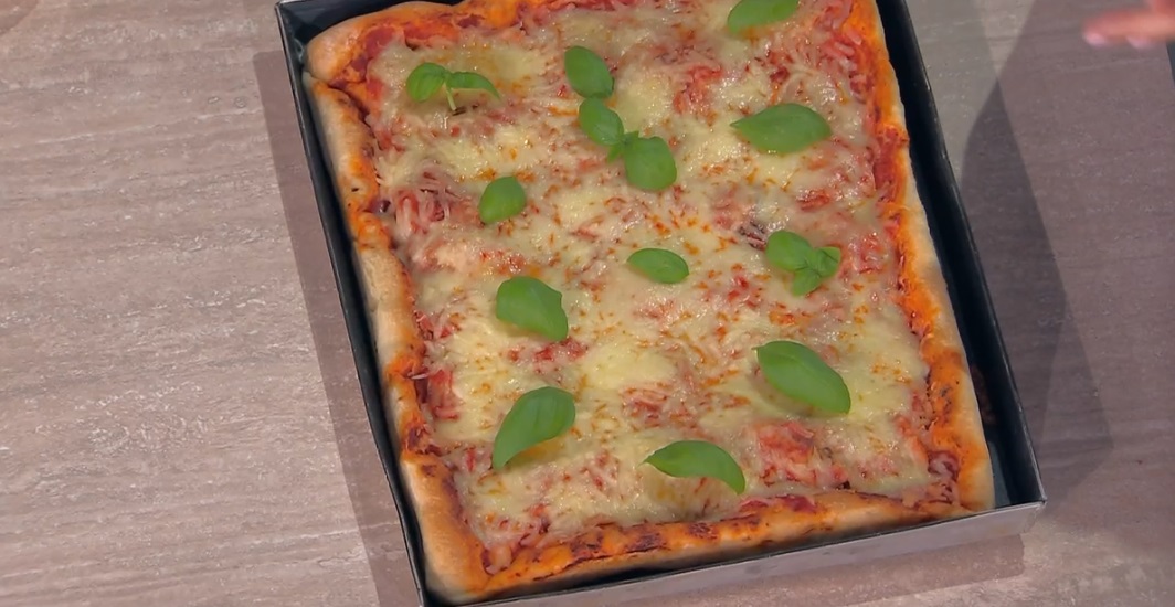 Schiacciamo l’impasto con le mani, fino a raggiungere i bordi della teglia. Condiamo la superficie con poca passata di pomodoro, quindi disponiamo sopra il prosciutto cotto affettato e copriamo quest’ultimo con la mozzarella per pizza tritata. Cuociamo in forno caldo e statico a 250° per 25 minuti.