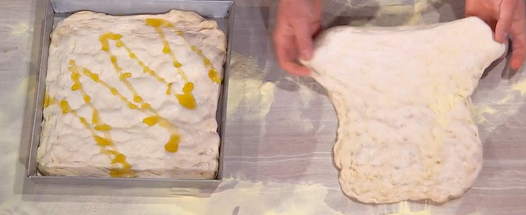Quando la biga è pronta, la lavoriamo con le mani, insieme alla farina tipo 2, il lievito di birra fresco e l’acqua, che aggiungiamo in 2-3 volte, alternandola al sale. Lavoriamo per qualche minuto e, infine, aggiungiamo l’olio ed impastiamo fino a farlo assorbire. Copriamo e lasciamo lievitare per 4 ore in frigorifero.