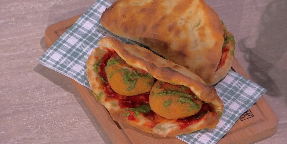 Apriamo le pizza appena sfornate e le farciamo con concentra di pomodoro, mozzarelle fritte, pesto di basilico ed una spolverata di formaggio grattugiato.
