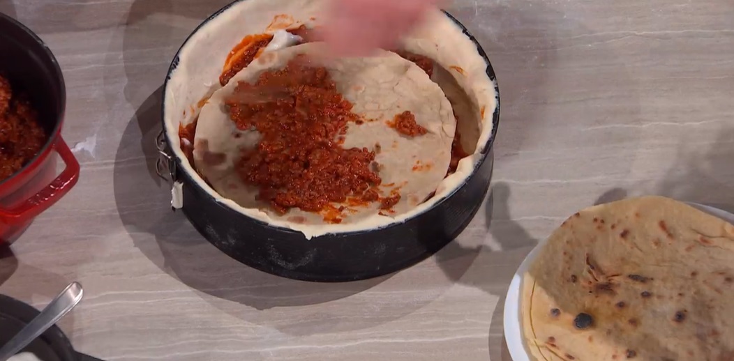 Con il mattarello, stendiamo l’impasto rimasto ad uno spessore di mezzo cm ed usiamo il disco ottenuto per foderare una tortiera. Spalmiamo sulla base un po’ di ragù freddo, dei fiocchi di besciamella, formaggio grattugiato e adagiamo sopra una delle ‘piadine’ preparate. Ripetiamo gli strati, fino ad esaurire le piadine. Finiamo con passata di pomodoro, besciamella e formaggio grattugiato. Cuociamo in forno caldo e statico a 240° per 25 minuti.