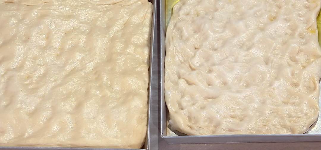 Dividiamo l’impasto in due parti e lo ripieghiamo su se stesso in maniera approssimativa. Posizioniamo ogni panetto su una teglia unta con abbondante olio. Copriamo e lasciamo lievitare al caldo (30-35°) per 1 ora. La stendiamo con le mani all’interno della teglia, fino ad arrivare ai bordi. Copriamo e lasciamo lievitare ancora 1 ora al caldo.