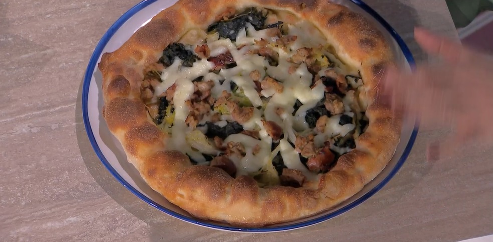 Prendiamo un panetto, lo stendiamo con le mani sul piano infarinato, dal centro verso i bordi, creando il bordo. Al centro, distribuiamo la salsiccia cruda sbriciolata, tutte le verdure sbollentate e strizzate (i friarielli li ripassiamo in padella con olio, aglio e peperoncino), mozzarella a fette e pecorino tritato.