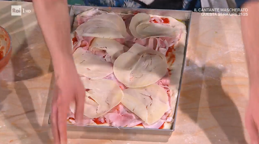Condiamo l’impasto lievitato e steso all’interno della teglia con pelati frantumati, prosciutto cotto affettato e caciocavallo a fette. Copriamo la farcitura con la pasta al burro. Spennelliamo con del burro a pomata ed adagiamo sopra l’altro rettangolo di sfoglia. Spennelliamo con l’uovo sbattuto e bucherelliamo con la forchetta. Lasciamo riposare ancora 45 minuti a temperatura ambiente. Cuociamo in forno caldo e statico a 220° per 20 minuti.