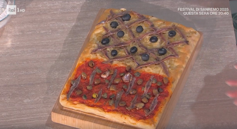 - Pissaladiere: 150 g cipolle bianche, 12 filetti di acciughe, 50 g olive nere, olio