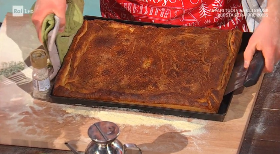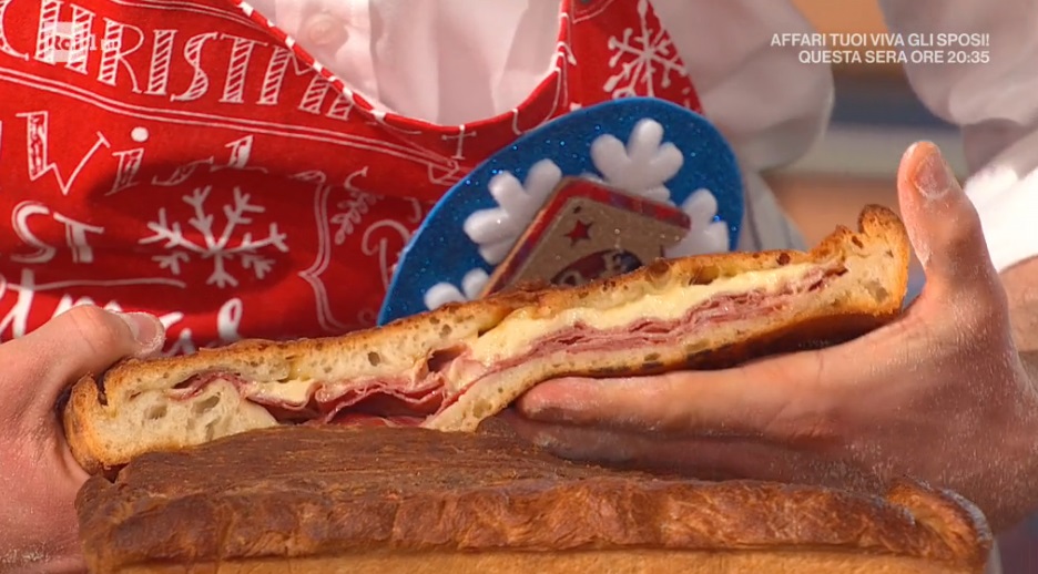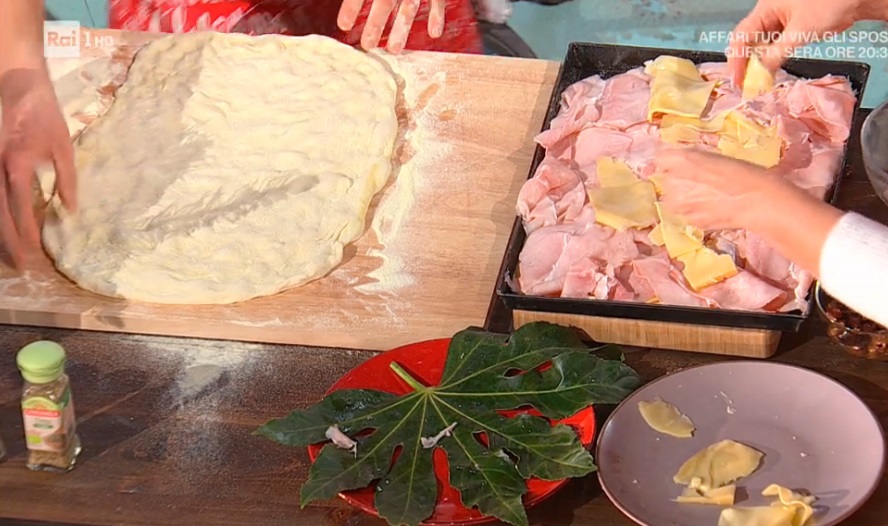 Stendiamo metà impasto lievitato all’interno della teglia rettangolare ben unta, con le mani. Distribuiamo sopra abbondante prosciutto cotto e formaggio a fette. Finiamo con le olive denocciolate e copriamo con l’altro rettangolo di pizza precedentemente steso, sigillando bene i bordi. Ungiamo la superficie con l’olio e pratichiamo un foro in centro. Cuociamo in forno preriscaldato a 250° per 20 minuti: primi 10 minuti, parte bassa del forno, gli ultimi 10 nella parte alta.