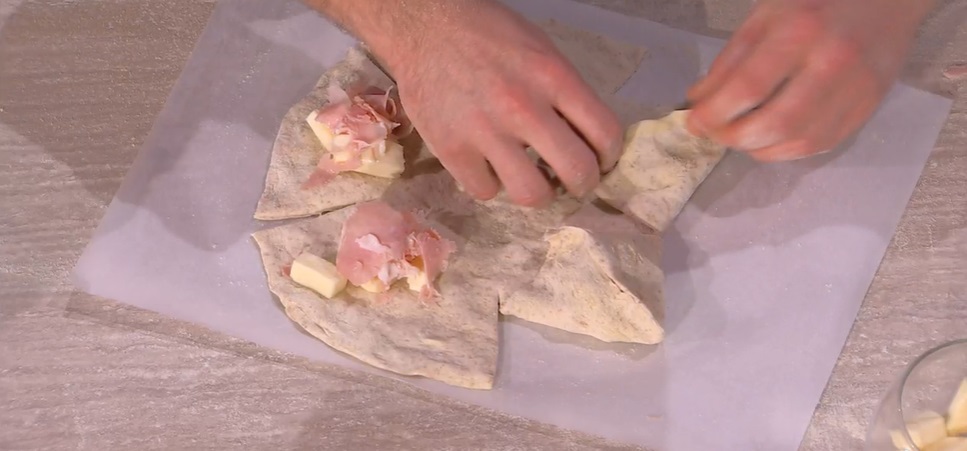 Con le mani o con il mattarello, stendiamo ogni panetto, in modo da ottenere un disco sottile anche sui bordi. Su ogni disco, mettiamo in 5 punti, vicino al bordo, la farcitura: mozzarella e prosciutto cotto. Pratichiamo delle incisioni intorno al ripieno, quindi ripieghiamo l’impasto sul ripieno, formando le punte della stella (foto).