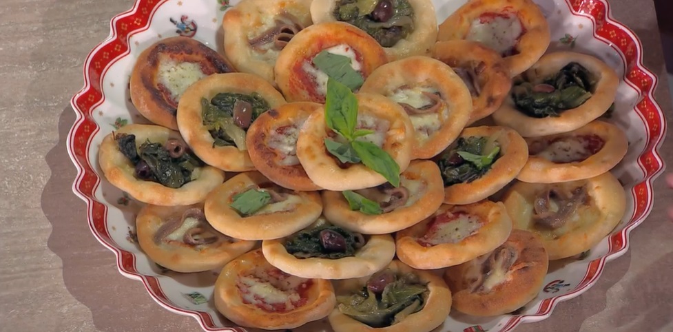 All’uscita dal forno, aggiungiamo alle pizzette rosse della mozzarella, delle alici su quelle bianche e della provola su quelle alla scarola. Le rimettiamo nel forno caldo per altri 3-5 minuti, parte alta del forno.