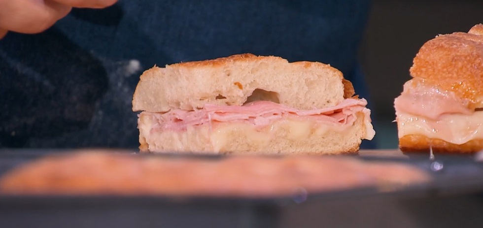 Da calde, le tagliamo a metà, come fossero panini, e le farciamo a piacere: Fulvio usa provola e prosciutto cotto. Le rimettiamo nel forno acceso per altri 5 minuti.