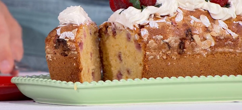 Puntata leggermente più breve, ma ugualmente ricca di ricette e golose idee. La prima ce la regala Daniele Persegani, che affaticato dal troppo lavoro, in tv e nel suo ristorante, propone un dolce da colazione, ovvero il plumcake fragole e mandorle.
