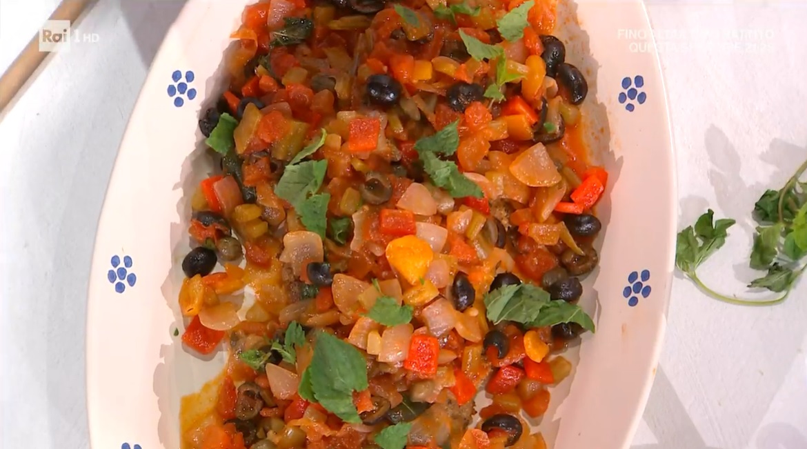 - Salsa: mezzo peperone verde, mezzo peperone rosso, mezzo peperone giallo, 6 pomodori tondi maturi, 2 cipolle bianche medie, 1 foglia di alloro, 1 cucchiaio di concentrato di pomodoro, 2 coste di sedano, 60 g olive nere, 40 g zucchero, 30 g capperi dissalati, 40 ml aceto bianco, menta
