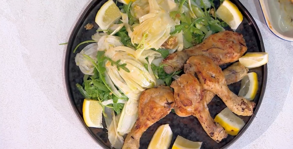 - Insalatina: 2 finocchi, 1 gambo di sedano, 1 cespo di rucola, 100 g noci, 100 ml spremuta di pompelmo, maggiorana, 250 ml olio evo