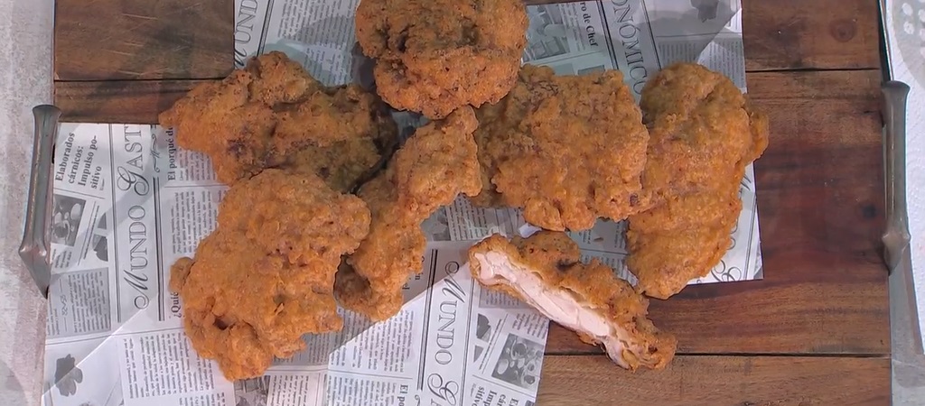 Preleviamo la sovracoscia di pollo e, senza scolarla troppo, la rotoliamo nell’amido di mais. La mettiamo a friggere in olio caldo e profondo per 2 minuti. La scoliamo e la ripassiamo nella pastella, quindi la tuffiamo nuovamente nell’olio e lasciamo friggere fino a doratura.