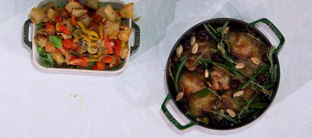 - 2 kg cosce di pollo, 500 g fagiolini, 200 g amarene sciroppate, 100 g mandorle tostate, 2 cipolle, 4 spicchi d’aglio, 500 ml brodo vegetale, 2 bicchieri di vino bianco, erbe aromatiche, olio, sale e pepe