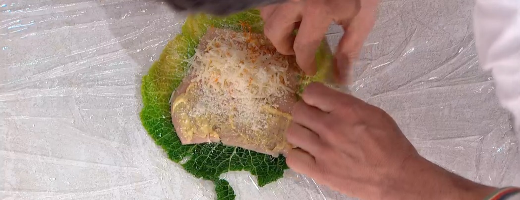 Sbollentiamo le foglie di verza e le stendiamo su un foglio di pellicola. Le spennelliamo con la senape, spolveriamo con il pecorino grattugiato e posizioniamo sopra una fettina di pollo crudo. Spennelliamo quest’ultimo con altra senape e su un lato mettiamo del caciocavallo grattugiato, del timo, scorza grattugiata d’arancia e pecorino grattugiato. Arrotoliamo la verza sul ripieno, aiutandoci con la pellicola, dando la forma di un rotolino. Chiudiamo a caramella e lasciamo riposare in frigorifero. Dopo il riposo, eliminiamo la pellicola e passiamo gli involtini nell’olio e nel panko. Li disponiamo su una teglia e cuociamo in forno caldo a 160° per 25 minuti.