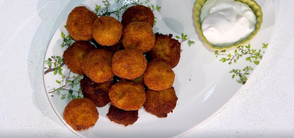 Formiamo le polpettine, quindi le passiamo nell’albume e subito dopo nel pane biscottato tritato. Le friggiamo in olio caldo e profondo fino a doratura.
