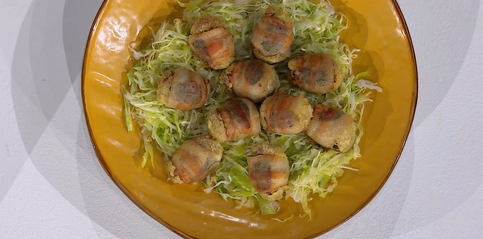 Formiamo le polpettine e le passiamo negli albumi sbattuti e nei fiocchi di patate (il preparato per purè). Avvolgiamo ogni polpetta in una foglia di allora ed una fettina di guanciale. Disponiamo su una teglia e cuociamo in forno caldo e statico a 180° per 15/20 minuti.