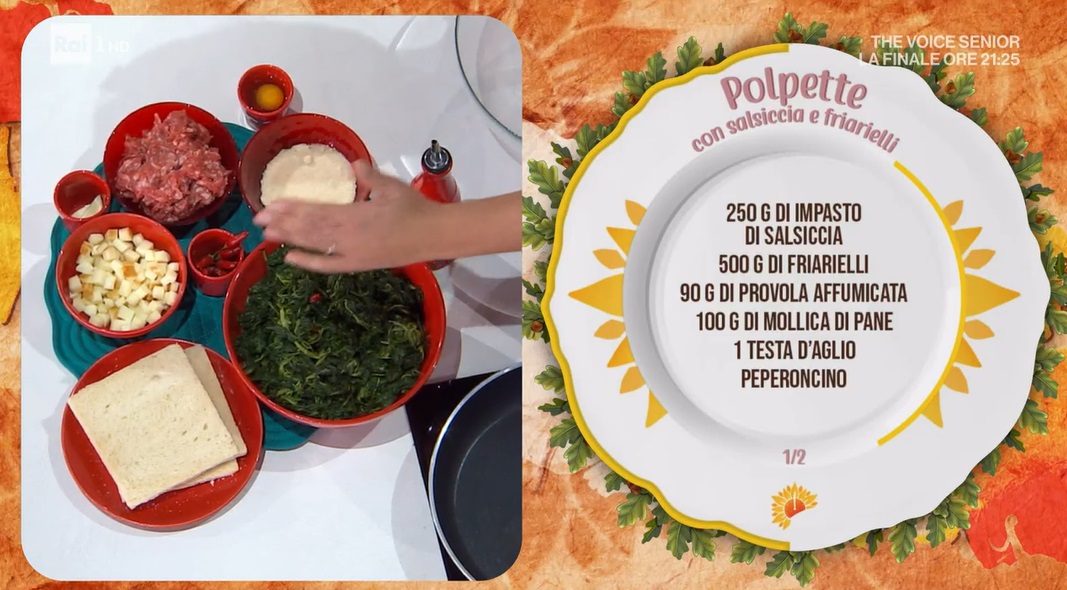 - 250 g salsiccia, 500 g friarielli, 90 g provola affumicata, 100 g mollica di pane, 1 testa d’aglio, peperoncino, 1 uovo, 50 g formaggio grattugiato, sale, olio
