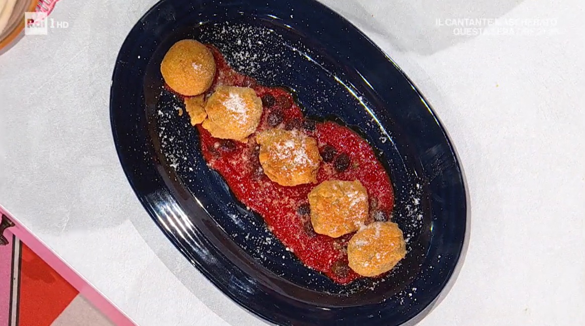 - 50 g olive, 20 g capperi, 500 ml passata di pomodoro, 1 spicchio d’aglio, 100 g farina, 200 g pangrattato, prezzemolo, pecorino grattugiato, olio per friggere