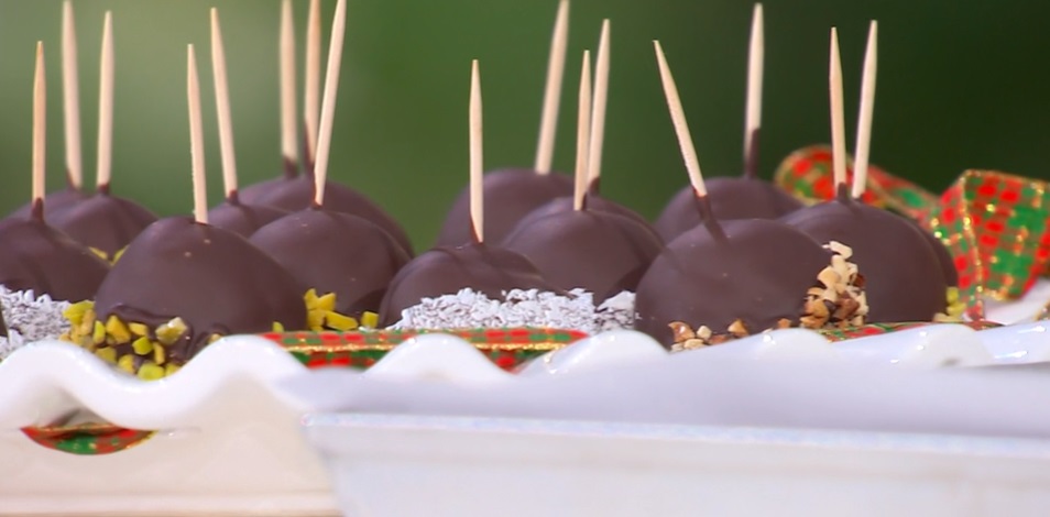 Con l’impasto di pandoro, formiamo delle polpettine. Le infilziamo con uno stuzzicadenti e le immergiamo nel cioccolato fuso, in modo da coprirle uniformemente. Le preleviamo e poggiamo il fondo delle polpette sulla granella di frutta secca o farina di cocco. Lasciamo solidificare a temperatura ambiente.