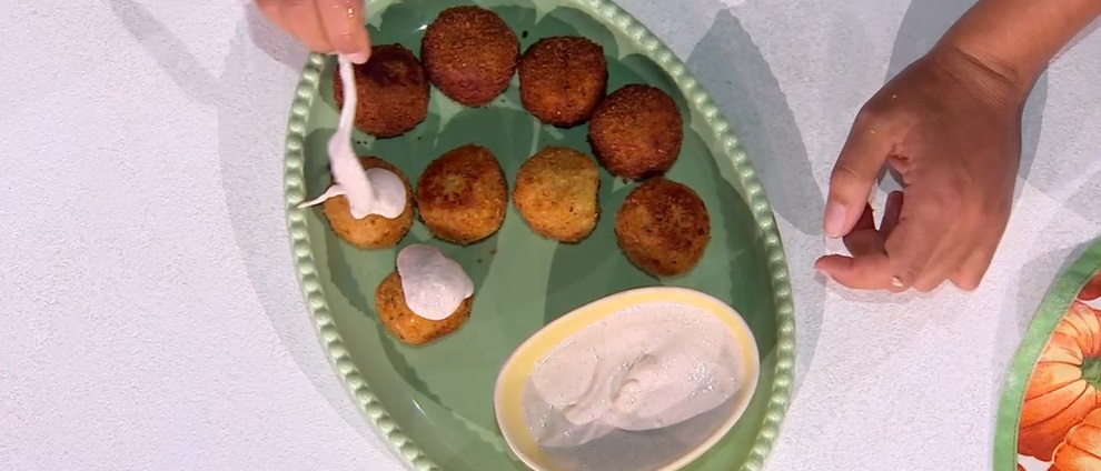 Preleviamo un po’ di impasto, inseriamo al centro un dadino di gorgonzola e richiudiamo, formando la polpetta. Le passiamo nell’uovo sbattuto e nella crosta di pane tritata, quindi le friggiamo subito in olio caldo e profondo.