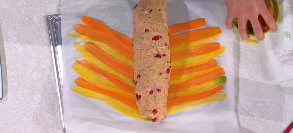 - 700 g macinato di pollo, 40 g formaggio grattugiato, 60 g pangrattato, 2 uova, rosmarino, 70 g ribes rossi, 3 fette di prosciutto cotto, 300 g spinaci, 1 spicchio d’aglio, 20 g burro, 3 carote arancioni, 3 carote gialle, sale e pepe