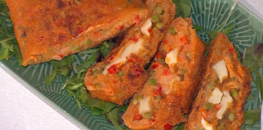 Su un foglio di carta forno unto d’olio e spolverato con pangrattato, distribuiamo l’impasto di patate. Lo appiattiamo e disponiamo sopra la mozzarella per pizza a fette. Arrotoliamo l’impasto sulla mozzarella, formando un polpettone, che avvolgiamo nella carta forno e chiudiamo a caramella. Facciamo cuocere in forno caldo a 200° per 20 minuti.