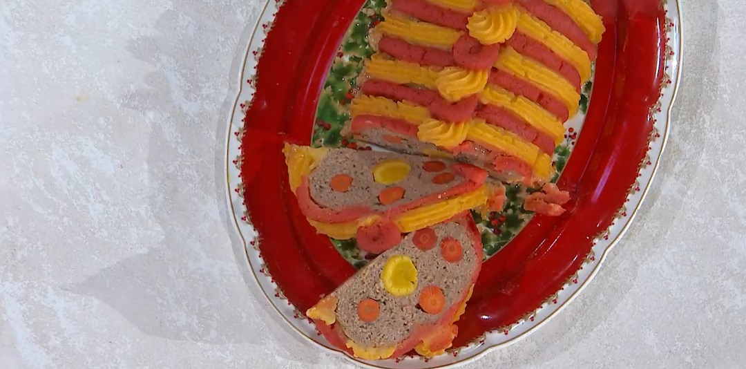 Sforniamo il polpettone e lo copriamo con il composto di patate, alternando i due colori. Rimettiamo in forno caldo e statico a 180° per 15 minuti.