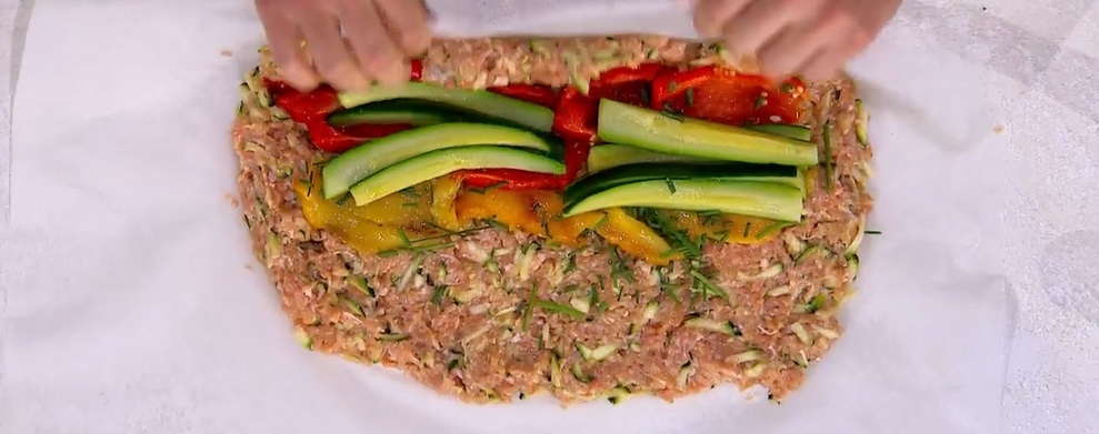 Su un foglio di carta forno, distribuiamo il composto di carni, formando un rettangolo spesso circa 2 cm. Disponiamo su un lato i peperoni a falde e le zucchine lessate, spolveriamo con erba cipollina tritata. Arrotoliamo la carne sul ripieno di verdure, formando il polpettone. Chiudiamo nella carta forno a caramella e cuociamo in forno caldo a 190° per 30 minuti.