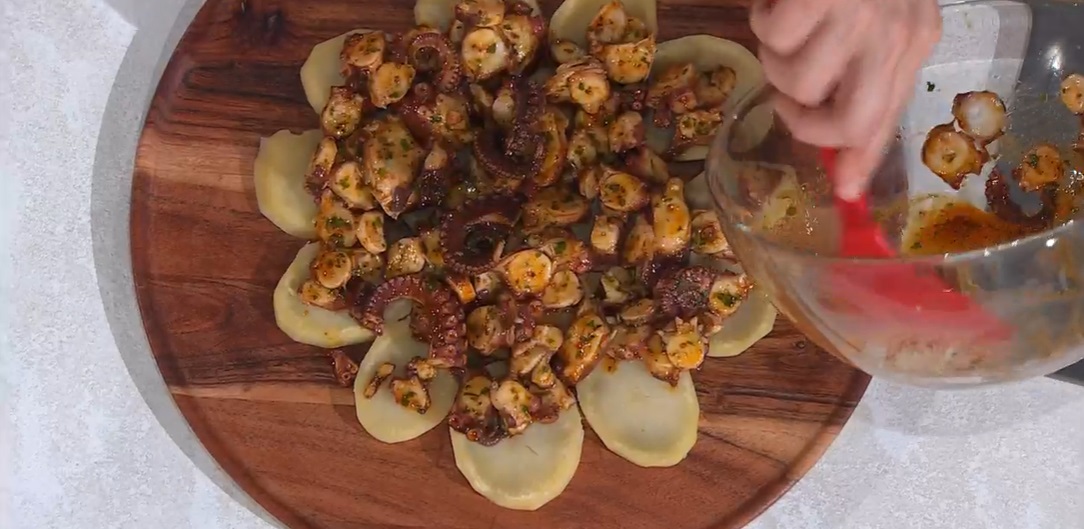 Mettiamo il polpo a pezzetti in una ciotola e lo condiamo con olio, sale, pepe, prezzemolo tritato. Uniamo anche il soffritto di paprika e mescoliamo. Serviamo con le patate lesse.
