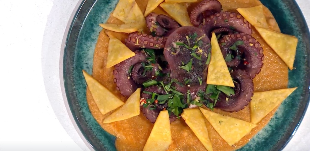 Scaldiamo una padella con un bel filo d’olio, una testa d’aglio tagliata a metà, del rosmarino e mettiamo a rosticciare il polpo intero, a fiamma alta. Una volta creata una crosticina sulla parte dei tentacoli, trasferiamo il polpo ed i condimenti su una griglia con carta forno e mettiamo in forno già caldo a 220°, grill, per 6 minuti. Una volta pronto, lo condiamo con olio a crudo, prezzemolo tritato, scorza grattugiata di limone, pepe macinato e peperoncino fresco tritato.