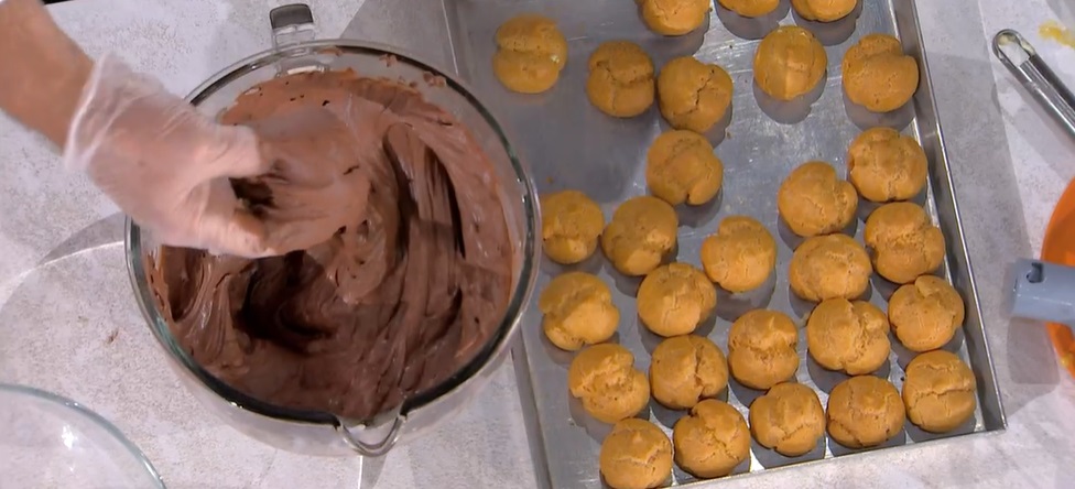 Farcitura: mescoliamo la crema pasticcera con la panna montata e zuccherata, delicatamente, con una spatola. Inseriamo in una sacca da pasticcere.