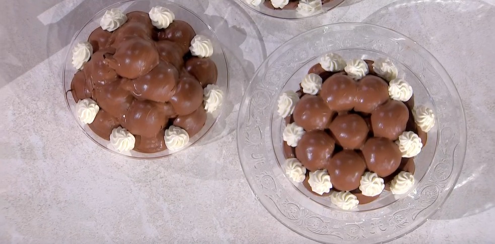 Farciamo ciascun bignè con la crema chantilly. Una volta farciti, li tuffiamo nella crema al cioccolato montata e li disponiamo sul piatto da portata. Decoriamo con ciuffi di panna.