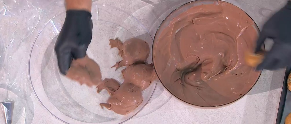 Partiamo dai bignè: scaldiamo l’acqua con il sale ed il burro. Quando il burro si è sciolto e la miscela raggiunge il bollore, uniamo la farina e mescoliamo energicamente fino a creare una palla che sfrigola. Trasferiamo in planetaria e cominciamo a mescolare. Aggiungiamo un po’ di uova per volta, continuando ad impastare fino ad ottenere un impasto vellutato, della consistenza di una crema pasticcera. Lo inseriamo in una sacca da pasticcere con bocchetta liscia da 10 mm.