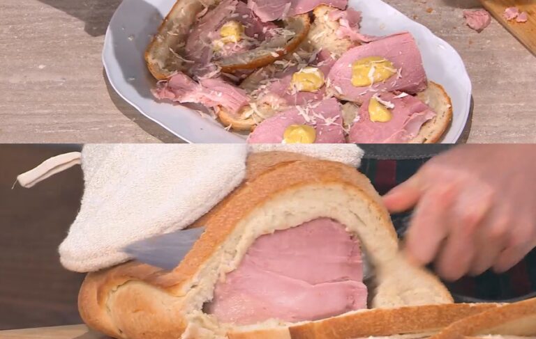 Con il mattarello, stendiamo l’impasto lievitato sul piano infarinato, creando un disco sottile. Posizioniamo al centro il prosciutto ormai freddo e lo avvolgiamo nell’impasto, creando un foro sulla sommità. Cuociamo in forno caldo e statico a 230° per 35 minuti.