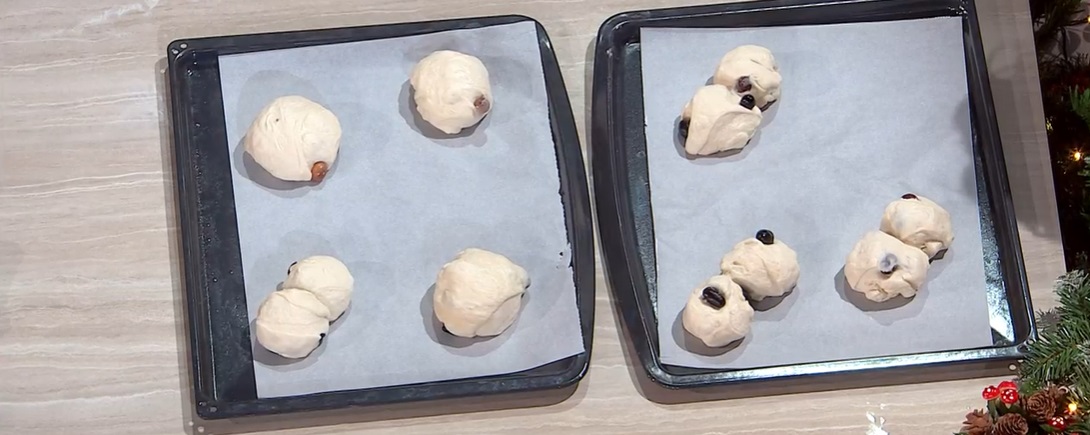 Dividiamo l’impasto in panetti (circa 6 o 7) e li ripieghiamo su loro stessi, dando la forma di palline rotonde e lisce. Possiamo ricavare 2 palline da un panetto ed unirle, come fossero ciliegie. Le disponiamo su una teglia con carta forno, copriamo e lasciamo lievitare 1 ora e mezza a temperatura ambiente.