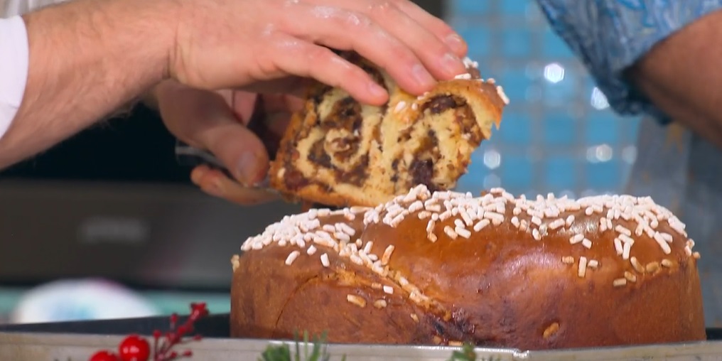 Arrotoliamo l’impasto sul ripieno, dal lato lungo, formando un salsicciotto, che chiudiamo a chiocciola. Lo inseriamo in una tortiera imburrata. Copriamo e lasciamo lievitare fino al raddoppio (circa 2 ore). Spennelliamo con l’uovo sbattuto e spargiamo sopra la granella di zucchero.
