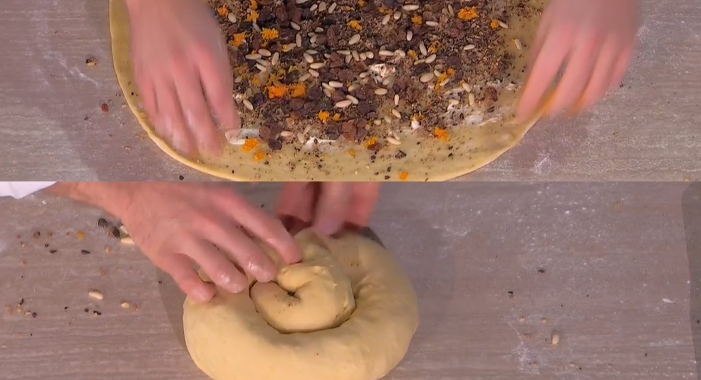 Stendiamo l’impasto con il mattarello, ad uno spessore di mezzo cm, dando la forma di un rettangolo. Con le mani, spalmiamo sopra un velo di burro a pomata. Distribuiamo sopra il mix di cioccolato e biscotti, i pinoli, l’uvetta e l’arancia e limone canditi a dadini.