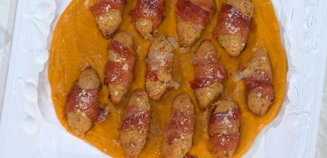 Su un foglio di carta forno, disponiamo qualche fetta di speck e, su ognuna, mettiamo una quenelle di impasto alle patate, impanata nel pangrattato, con al cuore un dadino di fontina. Un po’ di olio e mettiamo in forno caldo e statico a 200° per 15 minuti; dopo i primi 10 minuti, spolveriamo con il parmigiano grattugiato e finiamo di gratinare.