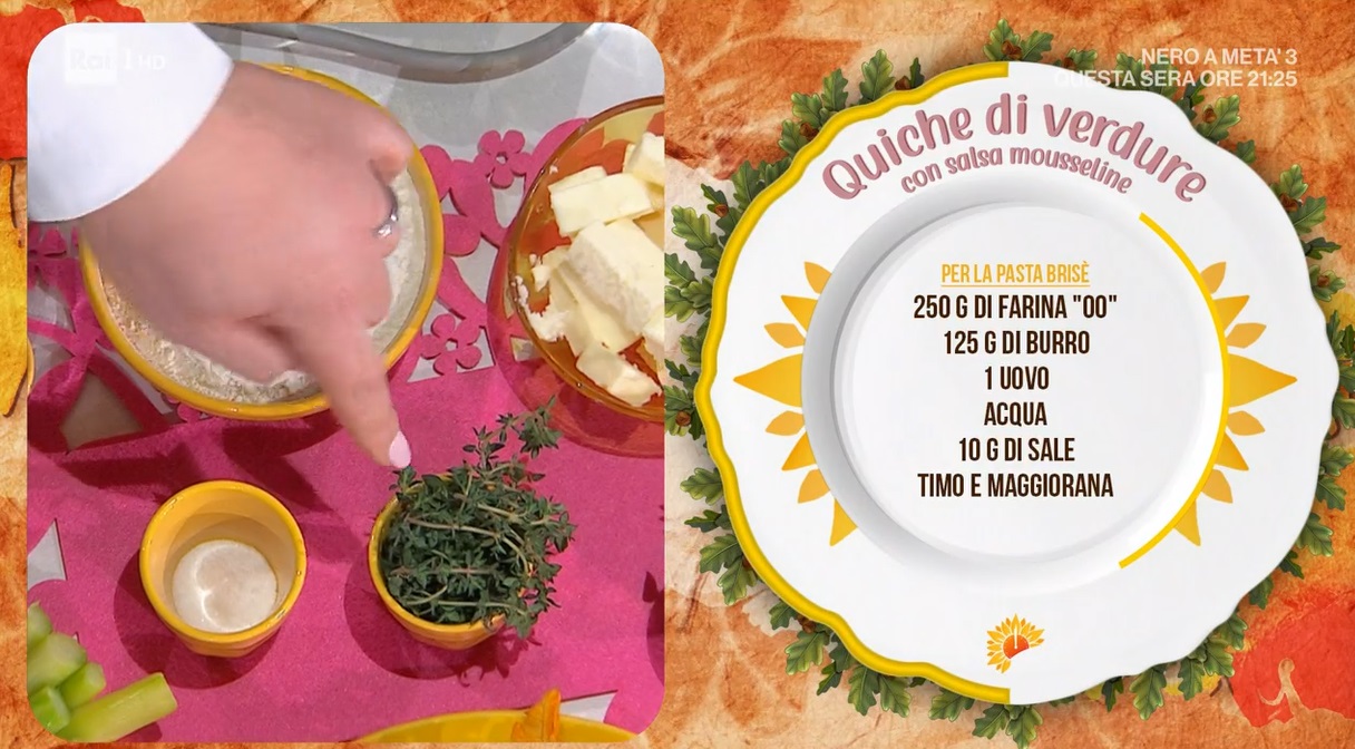 - Brisè: 250 g farina 00, 125 g burro, 1 uovo, acqua, 10 g sale, timo e maggiorana