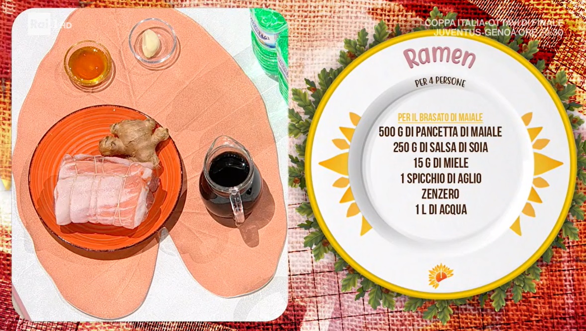 - Ramen: 2 l brodo di gallina, 400 g pasta ramen, 10 g cipollotto