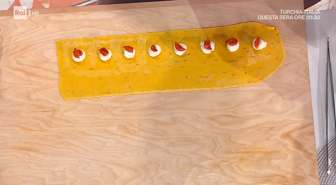 Tiriamo la sfoglia sottile ed adagiamo sulla stessa delle noci di ripieno di mozzarella con sopra mezzo pomodorino confit. Ripieghiamo la sfoglia sul ripieno, facciamo uscire l’aria e ritagliamo i ravioli. Li lessiamo in acqua bollente e salata.
