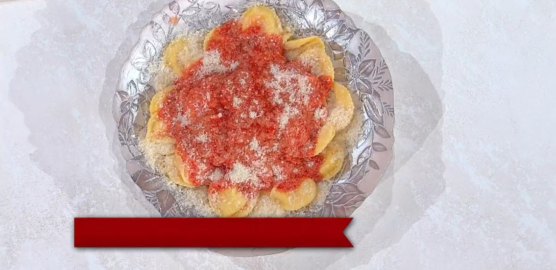 Tiriamo la sfoglia ed adagiamo sopra delle noci di ripieno. Ripieghiamo la sfoglia sul ripieno, facendola ben aderire. Ritagliamo i ravioli, che cuociamo in acqua bollente e salata. Li scoliamo e li condiamo con il sugo.
