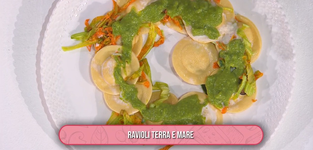 Scoliamo i ravioli e li mescoliamo con i fiori di zucca, le cozze sgusciate e un po’ della loro acqua. Serviamo sul piatto con sopra la salsa di zucchine e la fonduta di formaggio.