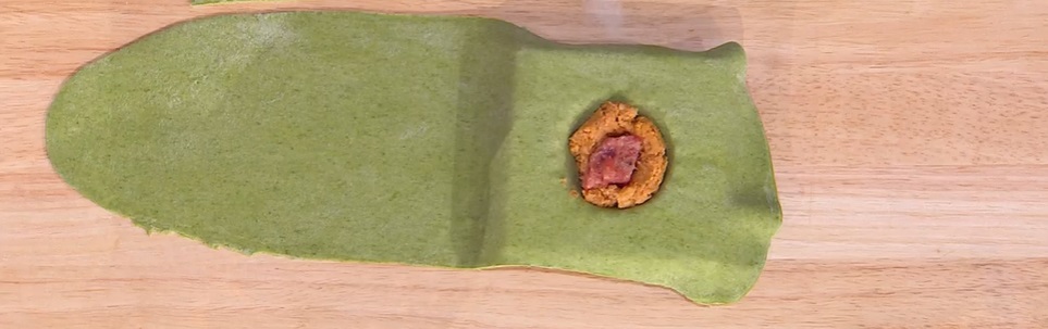 Tiriamo la sfoglia di pasta all’uovo (verde o meno). La posizioniamo su uno stampo apposito o un servi uovo e riempiamo l’incavo con il ripieno di lenticchie, inseriamo al centro un cubotto di zampone già cotto e ripieghiamo la sfoglia sul ripieno. Ritagliamo il raviolone e lo cuociamo in acqua bollente e salata per pochi istanti.