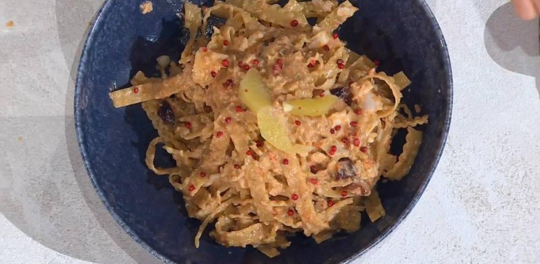 Infine sbricioliamo all’interno il baccalà cotto al vapore e mescoliamo. Scoliamo le reginette, le condiamo col sugo mantecando con un mestolo di acqua di cottura della pasta. Serviamo completando con spicchi di bergamotto e chicchi di pepe rosa.