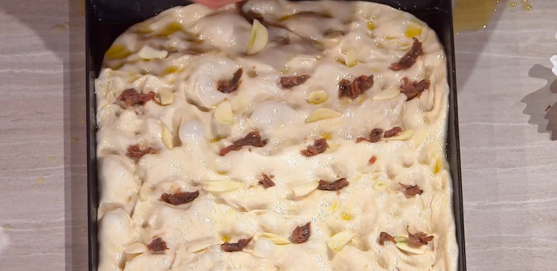 Con le mani, stendiamo la pasta lievitata all’interno delle teglie unte d’olio, fino a raggiungere i bordi. Incastoniamo nell’impasto l’aglio tagliato a fettine, le acciughe a pezzetti e copriamo con i pelati rotti con le mani. Lasciamo riposare ancora mezz’ora.